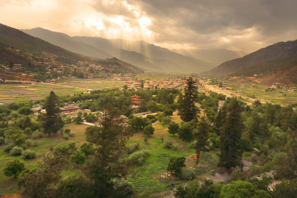 부탄의 첫 번째 임시 수도지로, 역사적인 의미와 아름다운 건물이 함께 어우러져 있습니다.